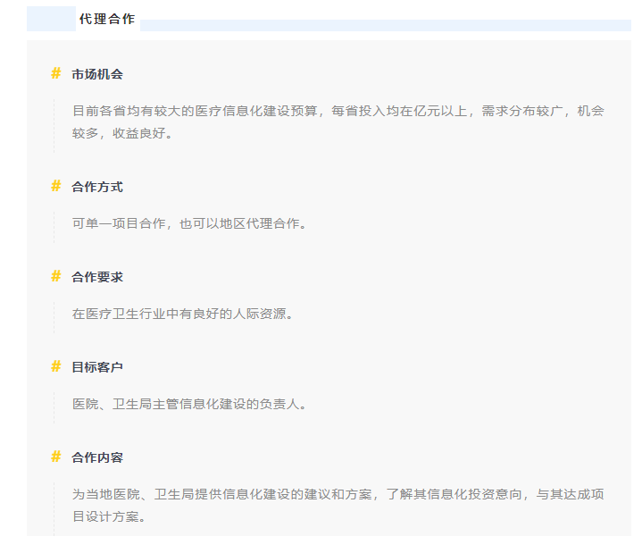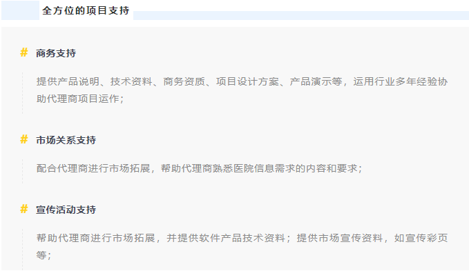 医汇科技在产品管理、市场推广、售前售后服务、技术支持、培训等诸多环节上,为合作伙伴提供强大支持。通过招标投标等商务过程,与其达成购买合同。